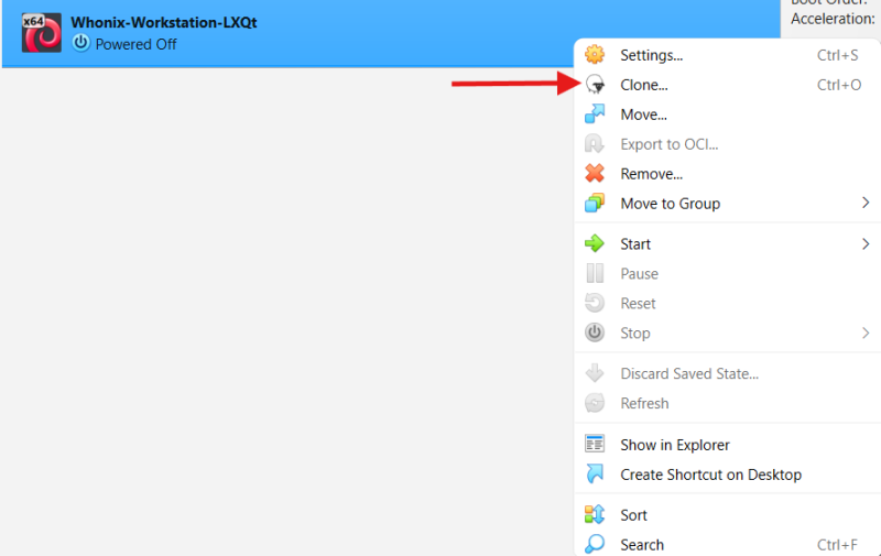 Highlight Whonix-Workstation→Open→Virtual Machine→Clone